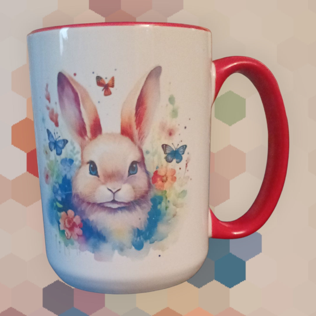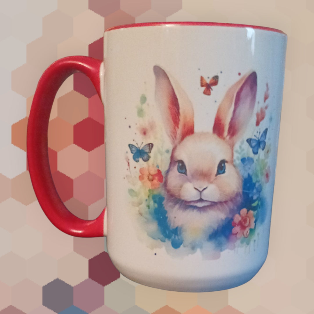 Cute bunny coffee mugs that comes in 11oz or 150z. Made with ceramic with a glossy finish. Handle and inner cup colors may vary.